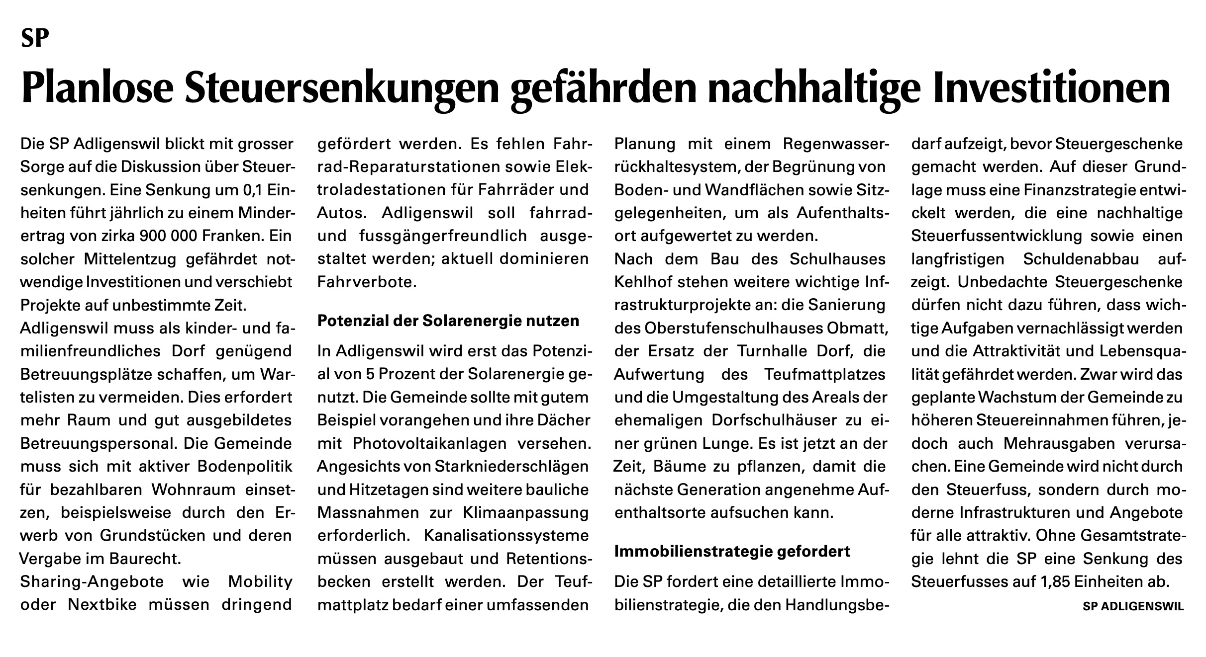 Die SP Adligenswil blickt mit grosser Sorge auf die Diskussion über Steuersenkungen.